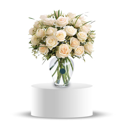 Vase with 30 Stems of Ivory Roses with Lavender Fillers , Grass & Greens